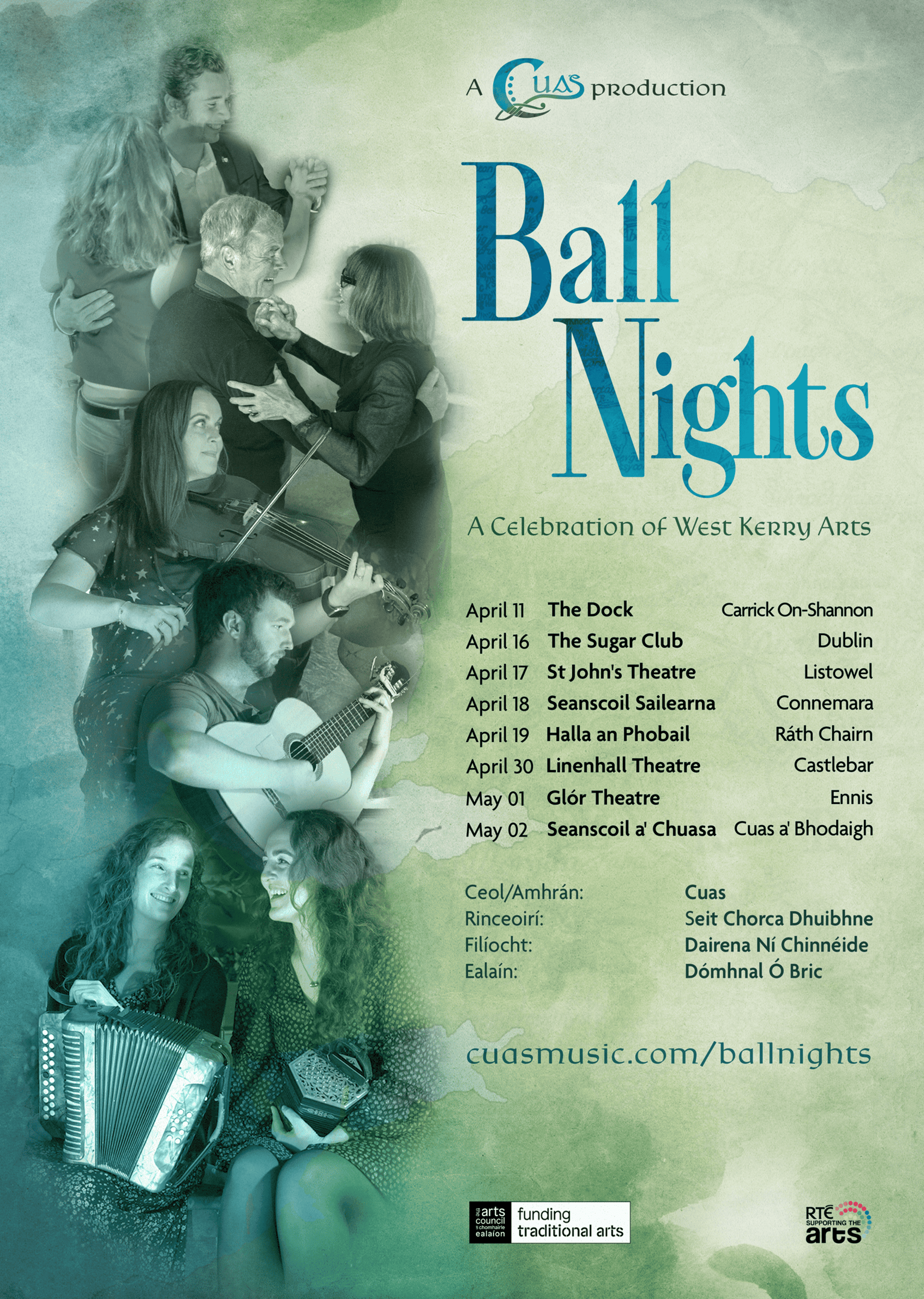 Ball Nights is a new production led by the celebrated West Kerry band Cuas, alongside the dynamic dancers of Seit Chorca Dhuibhne, poet Dairena Ní Chinnéide, and artist Domhnall Ó Bric. Together, they breathe fresh life into these community traditions. Audiences across Ireland will experience first-hand the wild energy and distinctive spirit of West Kerry — singing songs, joining the dancing, and becoming part of an immersive celebration of place and culture.